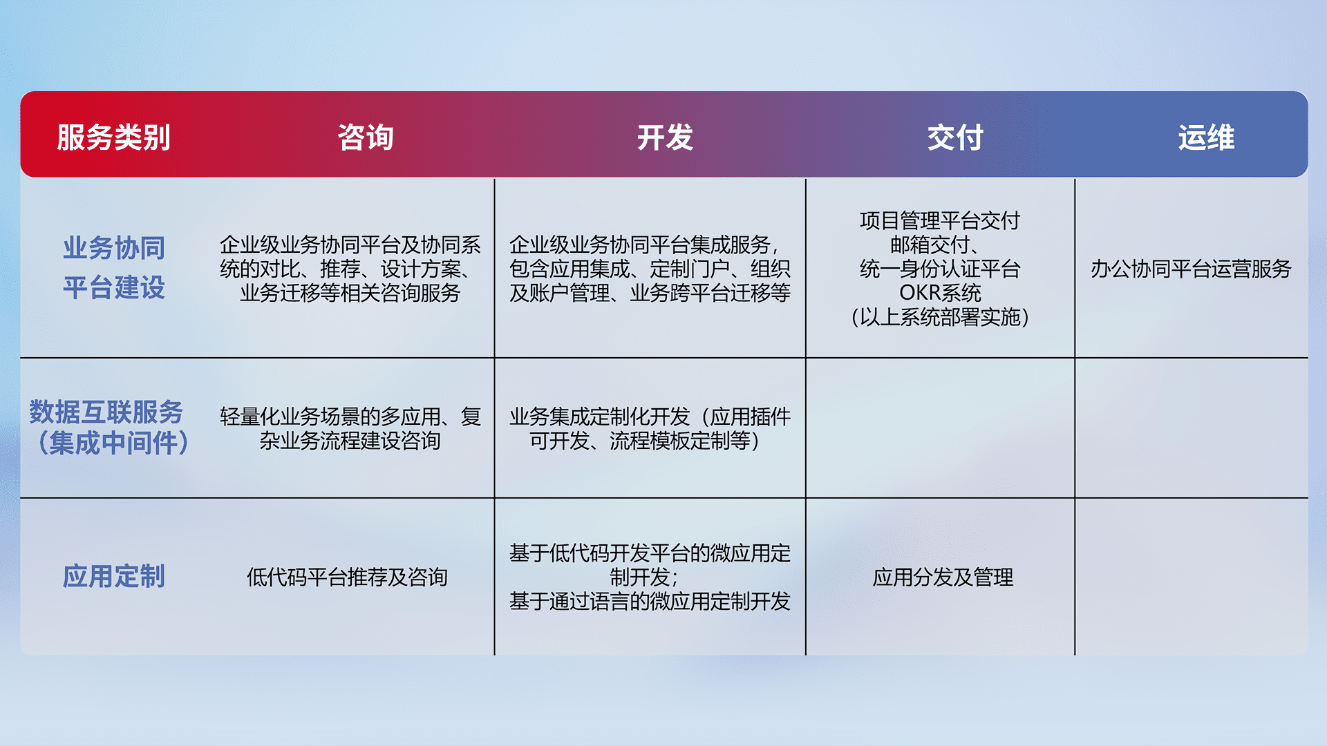 针对钉钉、、、、企微、、、、IDaas等平台级产品提供产品的规划、、、、方案、、、、交付、、定制化开发等服务,,,,实现如统一协同办公、、、智能客户服务、、混合会议管理、、、、智能数据查询、、等业务场景,,,实现数字化转型。。。