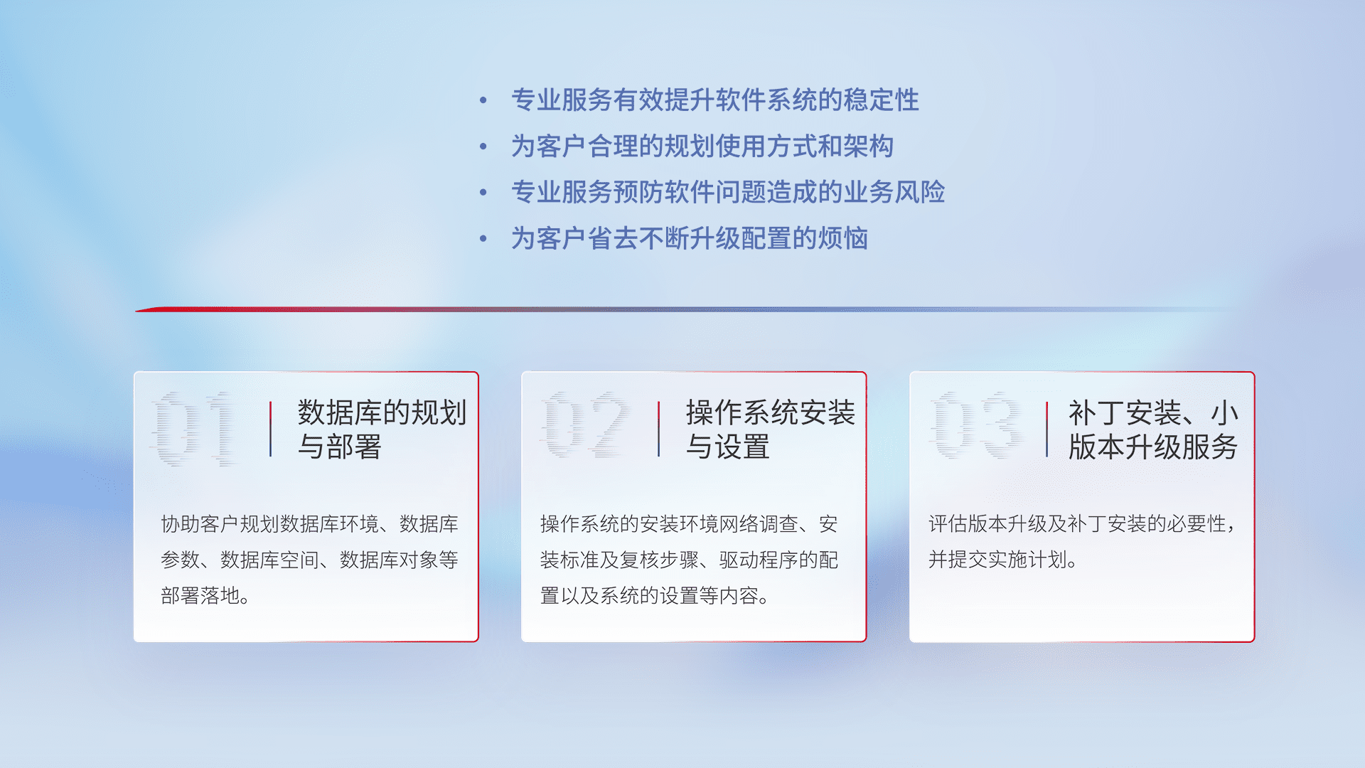 为客户提供软件规模升级、、快速部署、、按需配置的专业服务,,,,从数据库的规划与部署到操作系统的安装与设置,,,,再到补丁安装和小版本升级提供支持。。。。